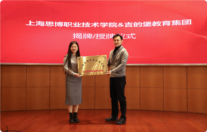 在与会嘉宾的共同见证下,黄正校长与龚宸谊总经理代表双方签署了校企合作协议。随后,双方共同为“上海思博职业技术学院&吉的堡教育集团产教融合人才培养基地”揭牌,吉的堡教育集团区域总督导、人才育成中心负责人姜冠群为上海思博职业技术学院吉德堡教育集团专项班授牌。
