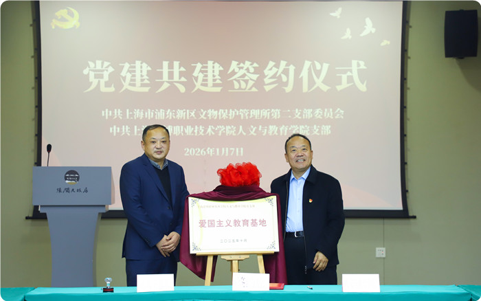 在全场人员的共同见证下,中共上海市浦东新区文物保护管理所第二支部委员会党支部书记李嵘与中共上海思博职业技术学院人文与教育学院支部委员会党支部书记张金福共同签署共建协议,并为爱国主义教育基地揭牌,标志着双方的合作迈入实质性阶段。